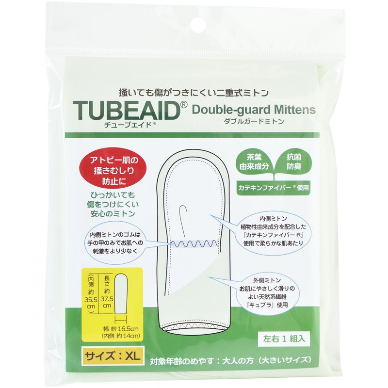アトピー性皮膚炎は強いかゆみを伴います。掻くと皮膚に傷がつき、その傷に雑菌が入ってもっと悪くなるという悪循環に陥りがちです。 『ダブルガードミトン』は、内側ミトンに肌あたりがやわらく、茶葉由来の抗菌成分を配合した新素材『カテキンファイバーR』、外側ミトンには滑りの良い天然系繊維キュプラを使った二重式の掻き破りを防ぐミトンです。掻いても二枚のミトンが空滑りし、皮膚を傷つけにくくなっています。洗濯して繰り返し使用しても、内側ミトンの抗菌素材『カテキンファイバー R』の抗菌性能は持続します。 アトピー性皮膚炎以外にも、脂漏性湿疹や老人性乾皮症(皮脂欠乏性湿疹)、尋常性乾癬など、痒みが引き起こす掻破行為が悪化の原因となる症状において、年齢を問わず掻き破り予防目的としてご使用いただけます。