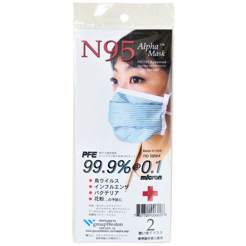N95 Alpha Maskは、0.1ミクロンの粒子ろ過有効率(PFE)99.9%です。 鳥ウイルス、インフルエンザ、SARS等ウイルス、炭疽菌等バクテリア、 花粉、ほこり、カビ等による アレルギーの予防に